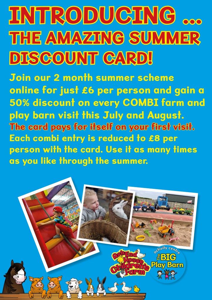 For a one-off membership fee of £6 per person (children and adults), each person then gains a large discount on each COMBI Farm and Play Barn entry, bringing the price of a day out at the farm and barn for 1 adult and 1 child down from £32 to £16. PURCHASE AHEAD OF YOUR VISIT AND THEN SHOW ON THE DOOR FOR AN ON THE DOOR DISCOUNT.