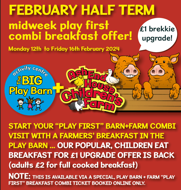 Monday to Friday during the February Half Term Holidays, we have a special play first COMBI ticket which is only £1 more than our standard play first ticket (£2 more for adults). This means you get a cooked breakfast in the play barn on arrival, up to 10am. There’s plenty of time to play too before going onto the farm to walk off those calories as this is a COMBI ticket with play and farm included.