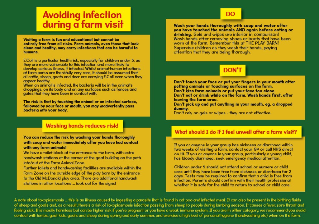 This page is to provide information to our visitors about safety on the farm; to help you have a safe day and to provide a reference for you should you have concerns afterwards. Please don’t hesitate to contact us should you have any need for further information.